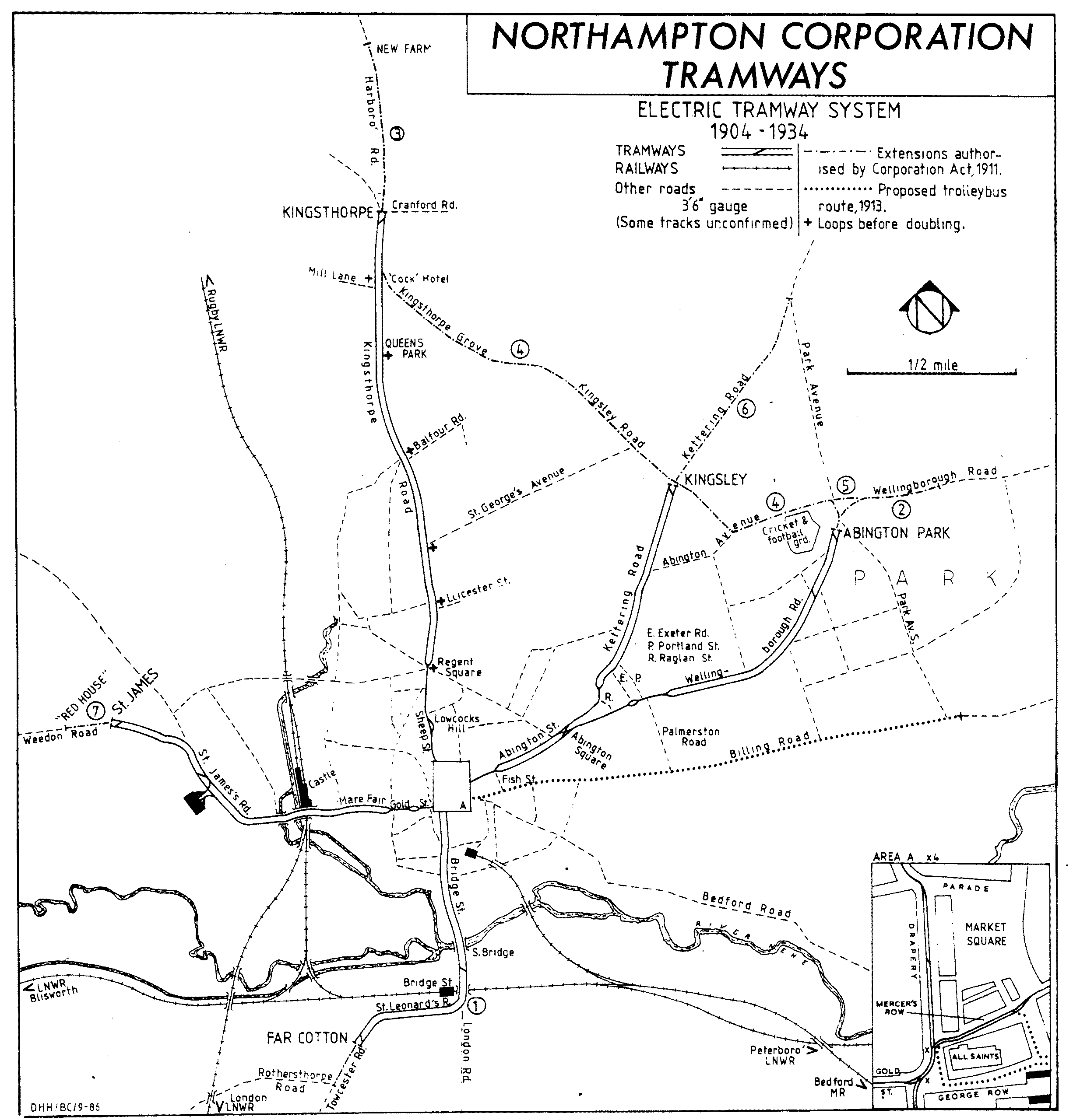 By the early 1920s Northampton’s transport services were considered strong. Trams ran in almost every direction, reaching the town’s outer edges except for the low-lying, flood-prone south-east. Fares were low—never more than 2d from All Saints’ Church, often 1½d—and many workers travelled at half-fare before 8 a.m. This contrasts with the modern practice of peak rates for commuters.